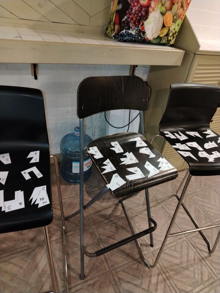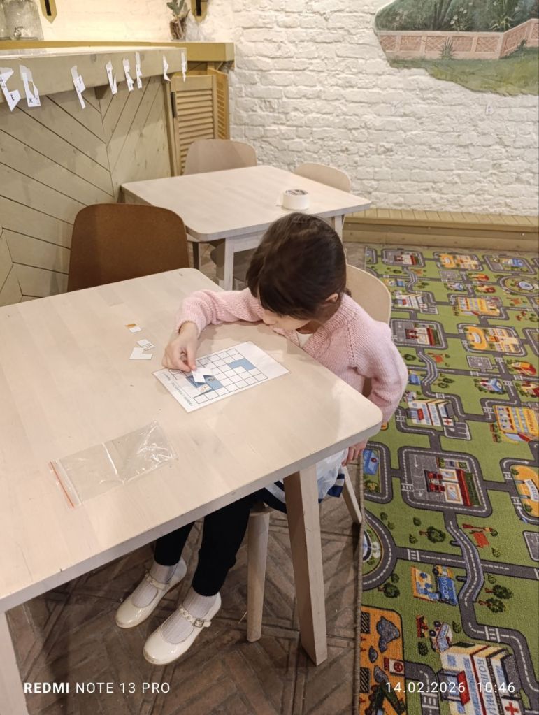 Потом был квест — сложи квадрат. Я сначала давала детям кусочек квадрата с цифрой, нужно найти вторую часть с буквой. Когда я понимала, что получается, то давала детям шифровки с цифрами, и дети расшифровывали слова. Можно было смотреть по уменьшенным кусочкам. А те, у кого сразу не получалось, могли взять кусочек в размер, и прикладывать, пока не получится квадратик.