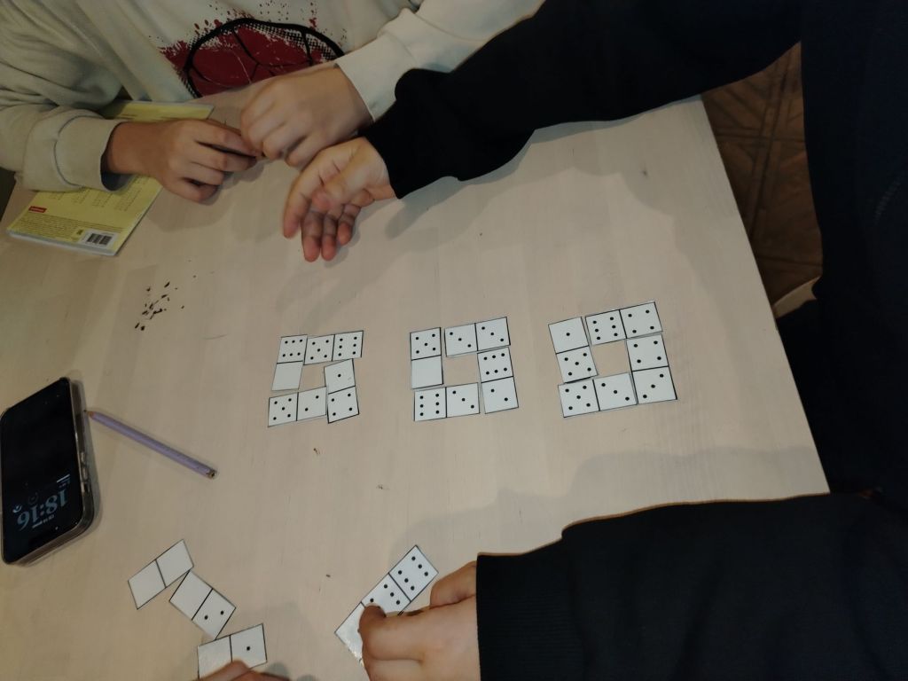 Ещё у старших было задание. Сложить из набора домино как можно больше квадратов из 4х доминошек с пустой серединкой так, чтобы суммы точек на сторонах из трёх квадратиков были одинаковыми. Вообще возможно 7 квадратов сложить. Но у нас максимум было 3.