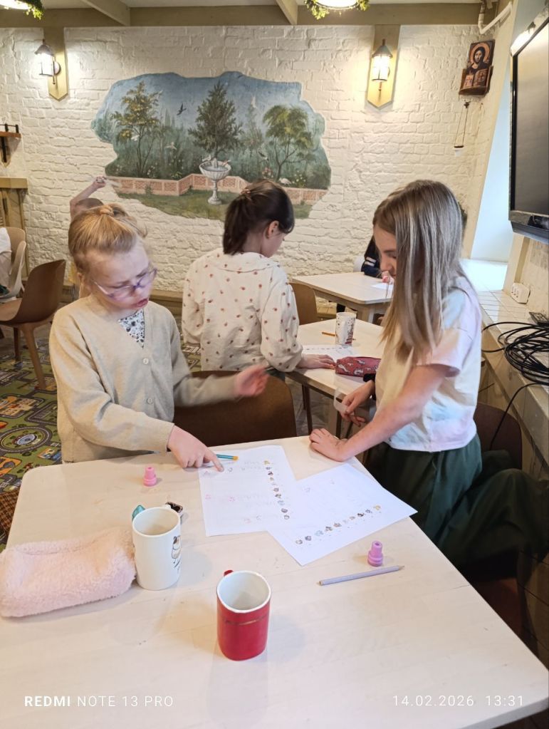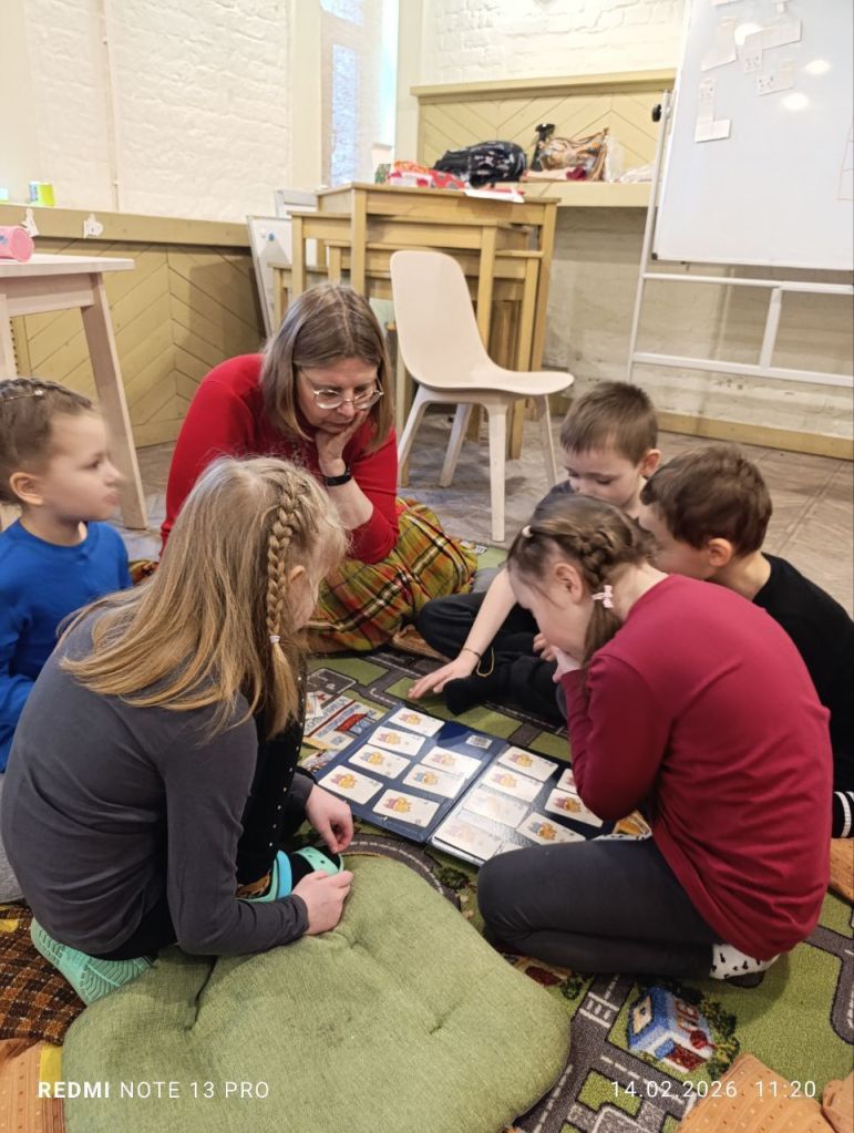 В начале урока мы играли в «Колядовщиков». Это такой кооперативный сет с рождественской тематикой. Я придумала эту игру лет 6-7 назад, а моя Аня её отрисовала.