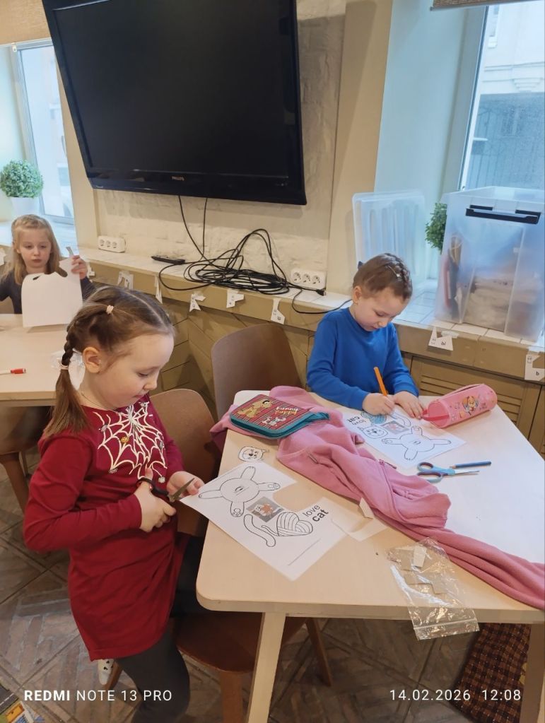 И была творческая работа. Пятилетки украшали варежки ценниками-наклейками так, чтобы было симметрично на двух варежках.