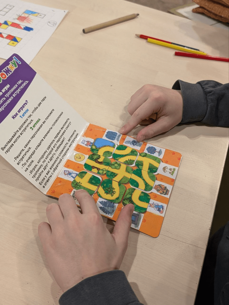 Пособирать композицию из кубиков «Сложи узор» по трем проекциям полезно очень многим. С 1-2 классом мы делали больше с помощью, а старшие в основном сами. Но в каждой группе были те, кому есть, над чем подумать.