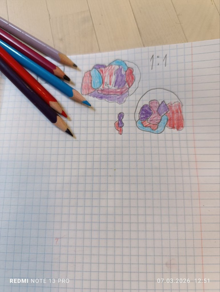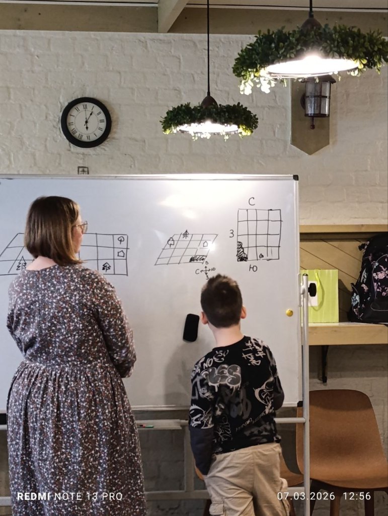 ПОтом с 1-2 классом мы делали листочек от Банды умников, где нужно от вида сбоку нарисовать вид сверху. Сначала просто так, а потом ещё с учётом ориентации по сторонам света.